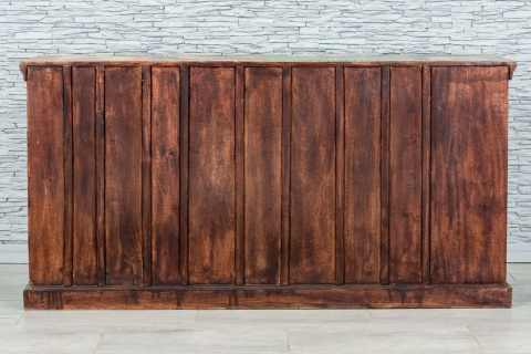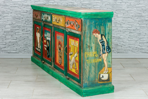 Duża, kolorowa komoda drewniana, ozdobiona komiksowymi rysunkami w stylu retro i angielskimi napisami. Komodę wykonano w całości z litego drewna mango. Mebel wybarwiono na różne kolory i przetarto. Komoda łączy w sobie niezwykły styl i funkcjonalność. Zaprojektowana tak, by można było umieścić ją w każdym pomieszczeniu. Posiada cztery szufladki i dwa duże schowki. Będzie piękną dekoracją orientalnego lub artystycznego wnętrza. Dobrze zestawiona sprawdzi się także w innych, nietuzinkowych aranżacjach. Polecamy do przestronnych wnętrz.