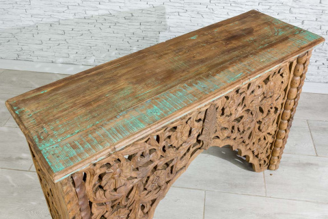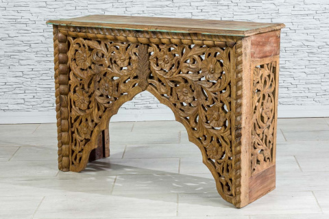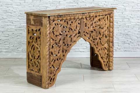 Ażurowa konsola indyjska rzeźbiona w kwiaty, wykonana z recyklingowego drewna tekowego.