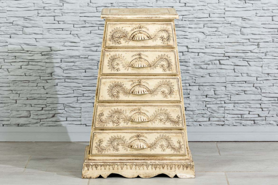 Szafka wykonana w małej manufakturze w Indiach z egzotycznego drewna mango. Umiejętnie połączono tu kolor postarzanego beżu z przepięknymi mandalami i innymi wzorami, malowanymi wypukłą farbą. Front z sześcioma szufladami urozmaicono dodatkowo rustykalnymi uchwytami, które idealnie pasują do postarzanej całości. Szafka doskonale sprawdzi się w orientalnym przedpokoju, lub przy sofie w kolonialnym salonie.