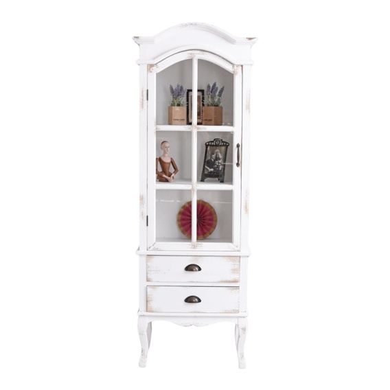 Witryna inspirowana stylem z dawnych lat. Wykonana z drewna i mocno przecierana dla uzyskania efektu vintage. Mebel o nietuzinkowym designie, pełen zachwycających detali. Zaprojektowano go tak by cieszył zarówno estetyką jak i funkcjonalnością. Dzięki przeszklonemu frontowi wyeksponujesz szkło, porcelanę lub inne ozdobne przedmioty. Szufladki w dolnej części witryny sprawdzą się na akcesoria stołowe lub inne przedmioty domowego użytku.