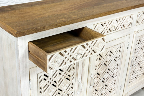 Indyjska, biała komoda ażurowa wykonana z litego drewna mango w stylu orientalnym. Mebel posiada przepiękne, rzeźbione fronty, które kryją za sobą pokaźną przestrzeń do przechowywania. Komoda ma schowki z półkami, a także trzy szuflady. Brązowy blat przepięknie komponuje się z jasną całością. Komoda zachwyca zarówno stylem jak i funkcjonalnością. Ozdobi przestronny salon w orientalnym wnętrzu lub hall w indyjskiej restauracji.