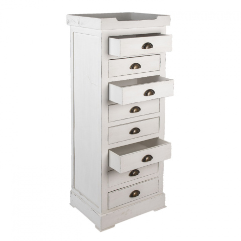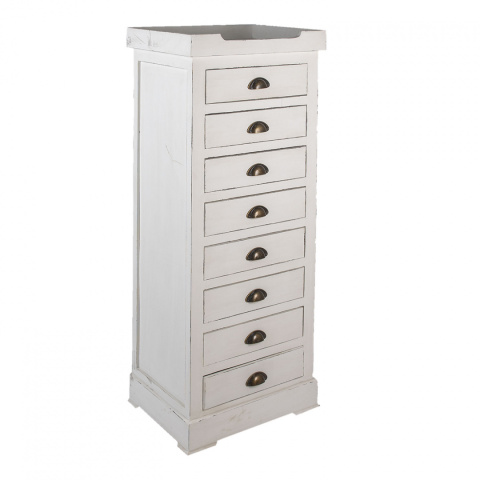 Wysoka, biała komoda drewniana z szufladami marki Clayre & Eef, która zadbała o dobry, ponadczasowy design i praktyczność w jednym. Mebel wykonano z litego drewna i wykończono przetarciami. Metalowe uchwyty dodają jej charakteru vintage i zwiewnej elegancji. Posiada osiem praktycznych szuflad, w których zmieścisz wiele przedmiotów.
