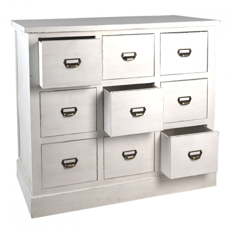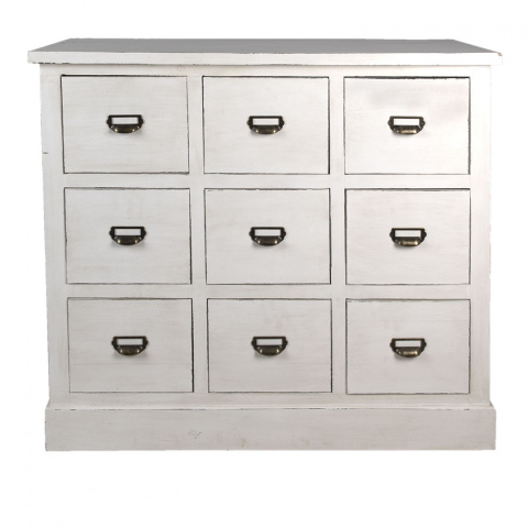 Biała komoda drewniana z szufladami marki Clayre & Eef, która zadbała o dobry, ponadczasowy design i praktyczność w jednym. Mebel wykonano z litego drewna i wykończono przetarciami. Metalowe uchwyty dodają jej charakteru vintage i zwiewnej elegancji. Posiada dziewięć praktycznych szuflad, w których zmieścisz wiele przedmiotów.