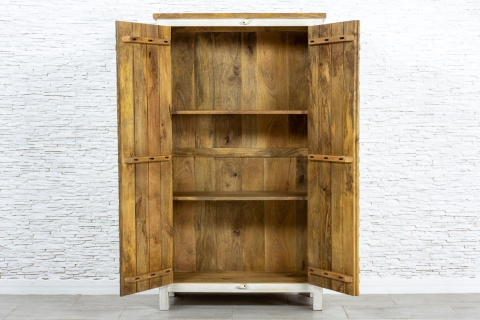 Biała, przecierana szafa indyjska wykonana z drewna mango. Ozdobne, rzeźbione fronty z mandalą połączono z przetarciami i okrągłymi uchwytami. Szafa posiada dwie wysokie półki. Mimo swojego niewielkiego wzrostu jest bardzo pojemna i praktyczna. Mebel odnajdzie się w każdym pomieszczeniu. Polecamy do przedpokoju, biura czy orientalnej łazienki.