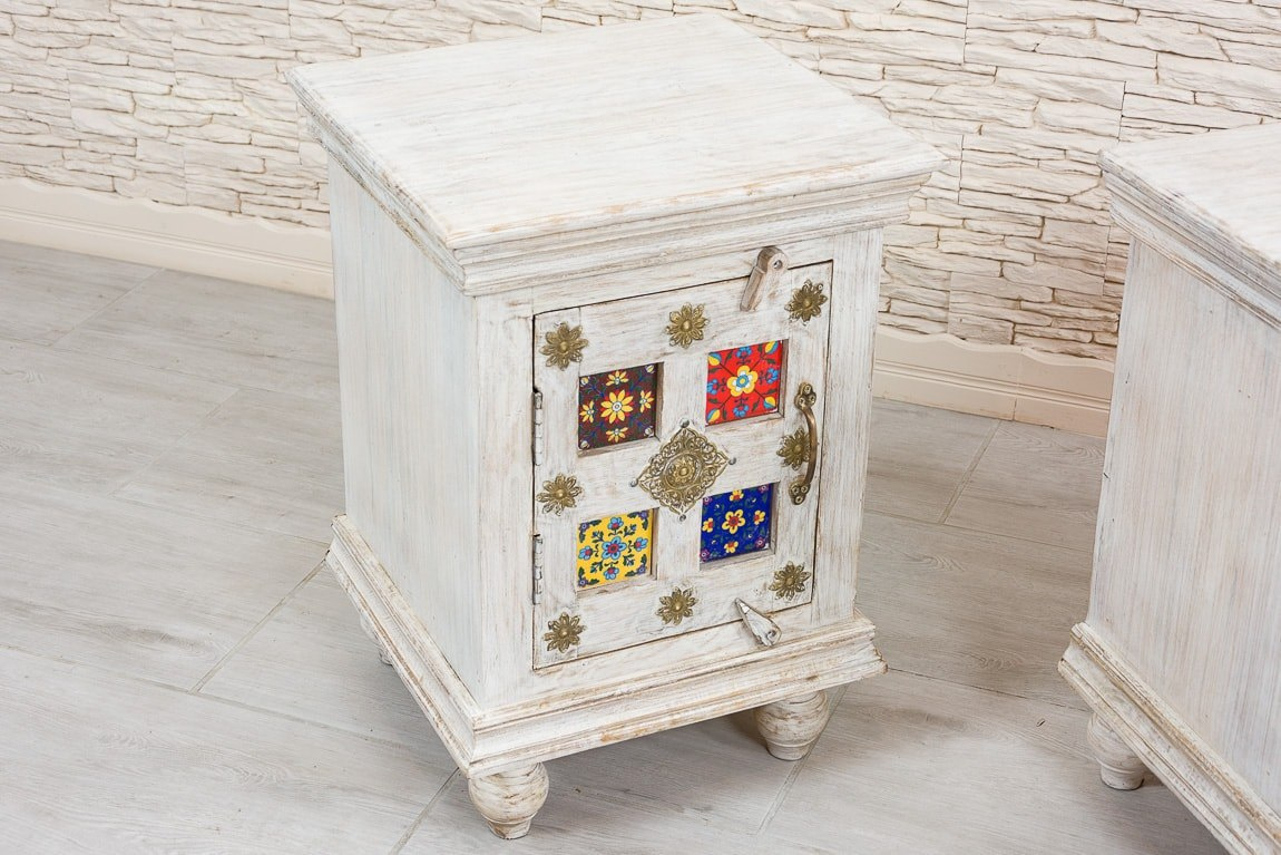 Zestaw pięknych, indyjskich szafek nocnych z ozdobnymi frontami. Te orientalne stoliki nocne łączą w sobie ponadczasowy styl, jakość wykonania i orientalną duszę. Szafki wykonane ręcznie w Indiach z egzotycznego drewna mango. Fronty ozdobione ceramicznymi płytkami i mosiężnymi dekorami. Cena za dwie sztuki. Możliwość zakupu tylko w komplecie