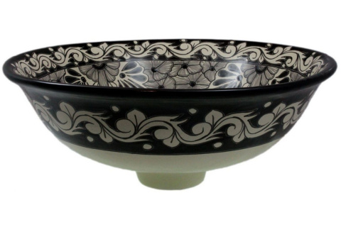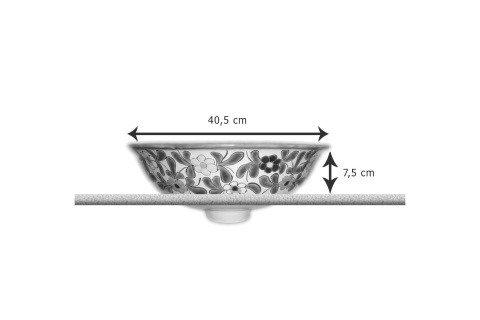 Piękna, ceramiczna umywalka nablatowa półwpuszczana w blat z Meksyku. Ta kolorowa ręcznie malowana umywalka, posiada wzory w środku i na zewnątrz. Misa może być częściowo wpuszczona w blat, co daje niebanalny efekt wizualny. Wszystkie umywalki są malowane ręcznie przez meksykańskiego artystę, więc każda umywalka stanowi unikalne dzieło sztuki użytkowej.