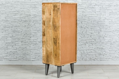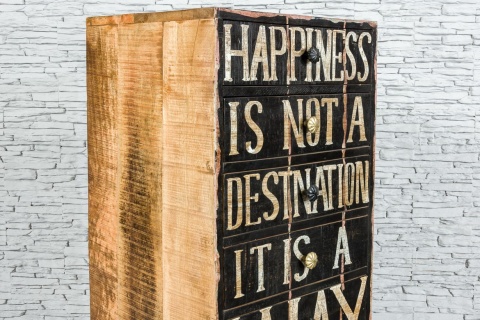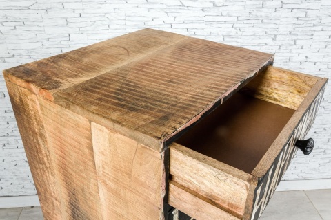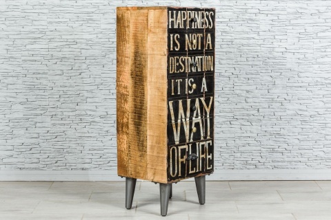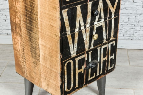 Unikatowa, czarna komoda indyjska z napisami w stylu vintage. Mebel wykonany z karbowanego, podpalanego drewna mango i wykończony rustykalnymi uchwytami. Komoda posiada aż siedem szuflad, z których każda została ozdobiona fragmentem angielskiego tekstu. Dolna szuflada jest głębsza od pozostałych. Front komody pomalowano na czarno i przetarto dla uzyskania efektu vintage. Smukłe nóżki dodają jej lekkości i charakteru retro.Komoda idealna zarówno do łazienki, sypialni jak i przedpokoju. Sprawdzi się we wnętrzach z klimatem. Polecamy zestawić z meblami w stylu loft dostępnymi w naszym sklepie.