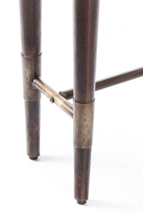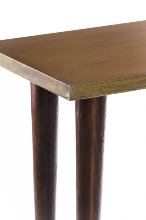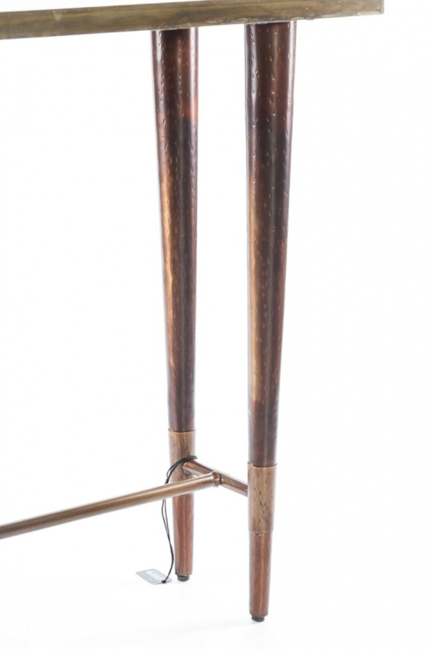 Designerska konsola MOLDE marki ALURO wykonana z litego drewna mango i metalu. Jej prosty, surowy kształt urozmaicono nierówną fakturą i okuciami w kolorze starego brązu wpadającego w złoto. Blat pomalowano nierówno. Widać więc na nim jakby ślady pędzla, co nadaje konsoli bardziej warsztatowo-loftowego charakteru. Mebel odnajdzie się w przedpokoju lub salonie. Z nowoczesnym kwiatem zaczaruje Twoje wnętrze i wydobędzie z niego industrialną duszę.