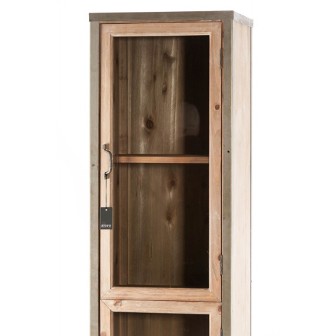 Wąska, przeszklona wysoka witryna HATTIE marki ALURO wykonana z drewna i metalu. Ma prosty, a zarazem wyrafinowany design. Surowa, stalowa konstrukcja, którą wypełniono szkłem i litą deską, zachwyca jakością wykonania i ponadczasową formą. Fronty mebla przypominają stare okna. Gięte uchwyty dopełniają wysmakowaną całość.