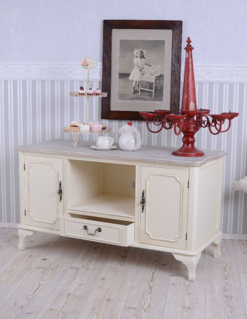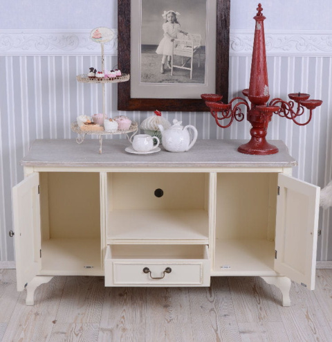 Szafka posiada dwa schowki, szufladę i otwartą półkę. Polecamy łączyć z produktami takimi jak: Stół w stylu shabby chic, witryna prowansalska, kredens w stylu vintage.