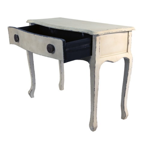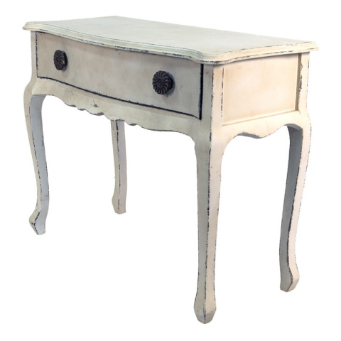 Ten piękny mebel inspirowany jest stylem z dawnych lat. Ludwikowskie nogi i przecierane wykończenie sprawiają, że konsola wygląda jak autentyczny przedmiot z minionej epoki. Oprócz walorów estetycznych jest również bardzo praktyczna. Dzięki dużej szufladzie zmieścisz w niej wiele drobiazgów, a na blacie wspaniale będzie wyglądała romantyczna lampa lub świeże kwiaty.
