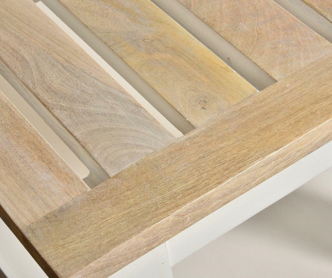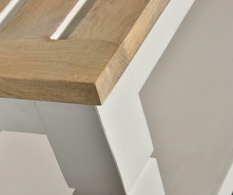 Siedzisko ławki wykonano z drewna mango, pobielono i zaimpregnowano olejem. Elementy bielone charakteryzują się niejednolitą kolorystyką przenikających się szarości oraz bladego różu. Ławka odnajdzie się we wnętrzach hampton, prowansalskich lub country. Zestawiona z delikatnymi, klimatycznymi meblami zaczaruje Twoje wnętrze. Półka pod siedziskiem sprawdzi się jako dodatkowa przestrzeń do przechowywania. Możesz ustawić na niej np. naturalne kosze lub inne przedmioty.