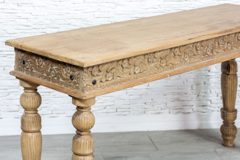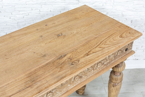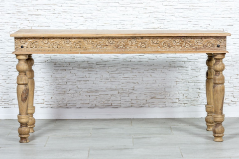 Szeroka, drewniana konsola indyjska wykonana ręcznie z drewna tekowego. Mebel posiada zjawiskowe, florystyczne rzeźbienie, które zdobi go wokół całej powierzchni blatu. Toczone, dekoracyjne nogi wykończono w stylu antycznym. Całość prezentuje się zjawiskowo i oryginalnie. Ta wyjątkowa konsola Odnajdzie się szczególnie w salonie lub przedpokoju.