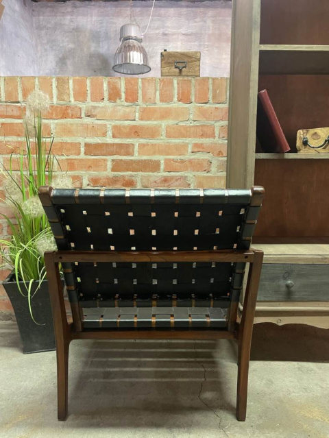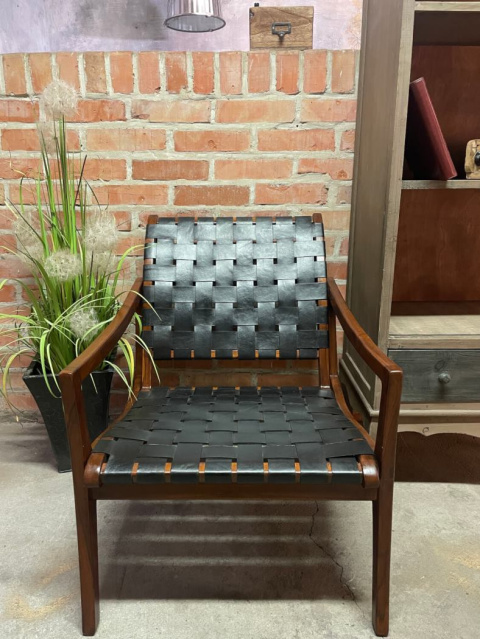 Krzesło wykonane z drewna tekowego i czarnej naturalnej skóry. Mebel dedykowany wnętrzom kolonialnym, loftowym, a także skandynawskim. Świetnie sprawdzi się w salonie lub przy biurku w pracowni. Dzięki podłokietnikom jest niezwykle wygodne i komfortowe.