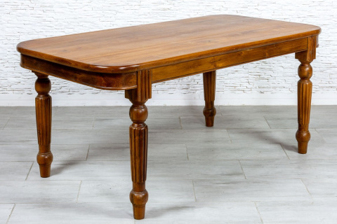 Nogi toczone w klasycznym, lekko pałacowym stylu, blat z ładnie wyoblonymi rogami, całość wybarwiona na odcień ciepłego, miodowego brązu. Stół idealny do stylowej, eleganckiej jadalni. Polecamy do wnętrz klasycznych i kolonialnych. Przy stole usiądzie wygodnie sześć osób.