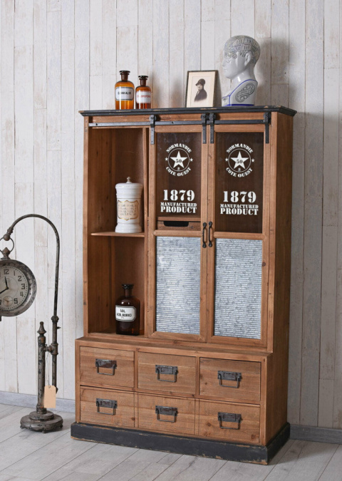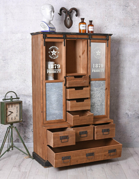 Witryna jest niezwykle pojemna i praktyczna. Posiada pojemne półki i schowki, a także osiem szuflad różnej wielkości. Polecamy łączyć z produktami takimi jak: stół z drewna i metalu, loftowe krzesła czy lampa w stylu farmhouse.