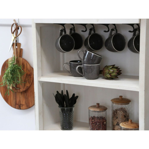 Regał posiada organizer na talarze, haczyki na kubki, cztery szufladki z metalowymi ozdobnymi uchwytami oraz otwarte półki. Pomieści więc wiele niezbędnych naczyń, a jednocześnie zaczaruje Twoją przestrzeń.