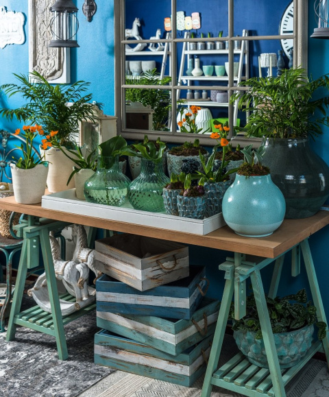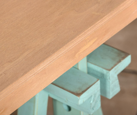 Jasny, drewniany blat umieszczono na pastelowych, postarzanych kozłach z półkami. Stół ma regulowaną wysokość, może więc pełnić wiele funkcji. Sprawdzi się jako tradycyjne miejsce do jedzenia, jako biurko lub blat roboczy.