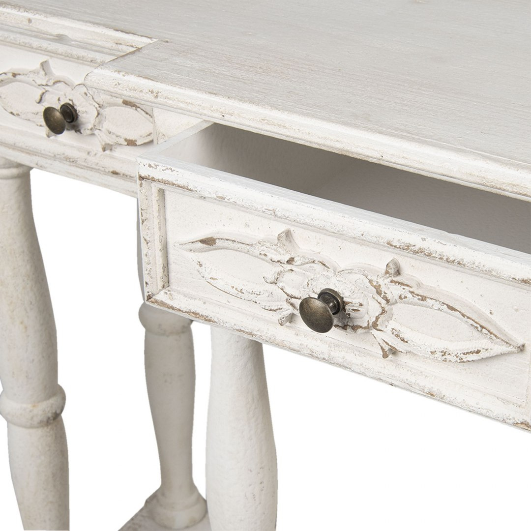 Mebel o bardzo eleganckim, dekoracyjnym kształcie. Bielony blat i masywną podstawę połączono ze stylowymi, toczonymi tralkami i przetarciami. Florystyczne zdobienia na szufladach dopełniają wysmakowaną całość i dodają meblowi charakteru vintage.