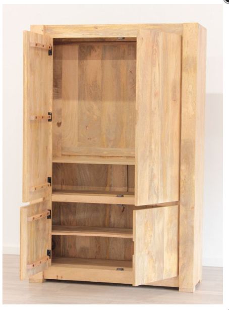 Ten masywny mebel został wykonany w małej manufakturze w Indiach. Do jego produkcji użyto egzotycznego drewna mango w jego naturalnym odcieniu. Szafa wykończona wodnym lakierem matowym. W tym meblu wszystko zostało wykonane z litej deski (fronty, półki jak również plecy mebla).