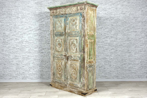 Duża, masywna szafa indyjska wykonana z drewnianych elementów recyklingowych, w małej manufakturze. Stare, antyczne, fronty o nierównej fakturze, zachwycają ręcznym rzeźbieniem i pięknymi pastelowymi odcieniami zieleni, niebieskości i bieli. Na górze szafę wykończono ozdobnym gzymsem. Mebel przecierany i delikatnie postarzony. Bielenie pięknie kontrastuje z kolorowym przodem. Rustykalne okucia w dolnej części są wspaniałym dopełnieniem wysmakowanej całości. Drzwi zamykane na duży skobel.