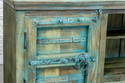 Szeroka, indyjska komoda RTV wykonana z drewna mango i pomalowana na odcień przepięknego turkusu z przetarciami. Mebel posiada dwa zamykane schowki, otwartą półkę i dwie małe szufladki. Fronty ozdobiono żelaznymi okuciami i uchwytami. Blat wyfrezowano i dodatkowo przetarto ranty. Szafka idealna pod telewizor do orientalnego salonu lub kolonialnej sypialni. Meble indyjskie wprowadzają do wnętrz wyjątkowy klimat i przepięknie pachną naturalnym drewnem.