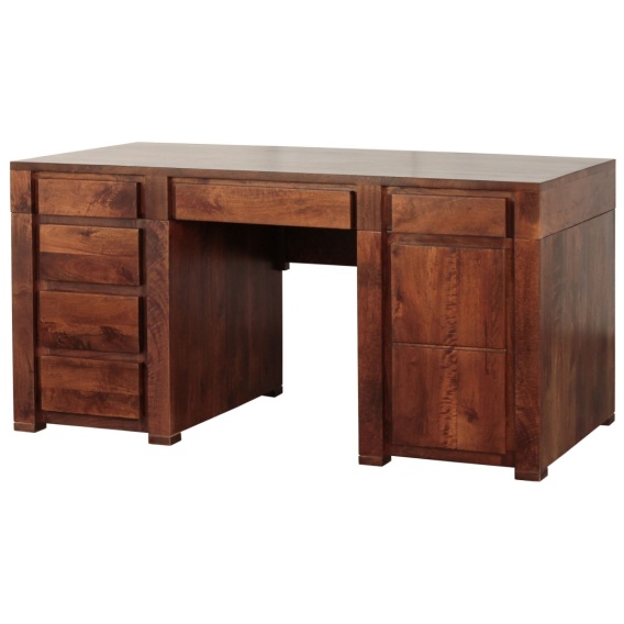 Eleganckie biurko indyjskie wykonane z wysokiej jakości litego drewna mango w pięknym kolorze ciepłego brązu. Całość mebla wykończona bezbarwnym lakierem satynowym z widoczną strukturą słoi. To nowoczesne biurko kolonialne posiada obszerny blat, aż sześć szuflad i boczną szafkę z wyjmowaną półką. Biurko odnajdzie się we wnętrzu kolonialnym lub inspirowanym orientem.