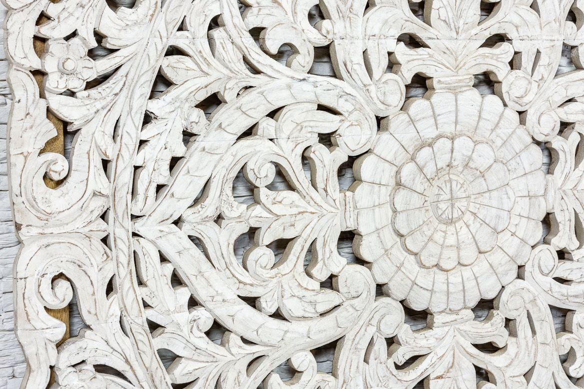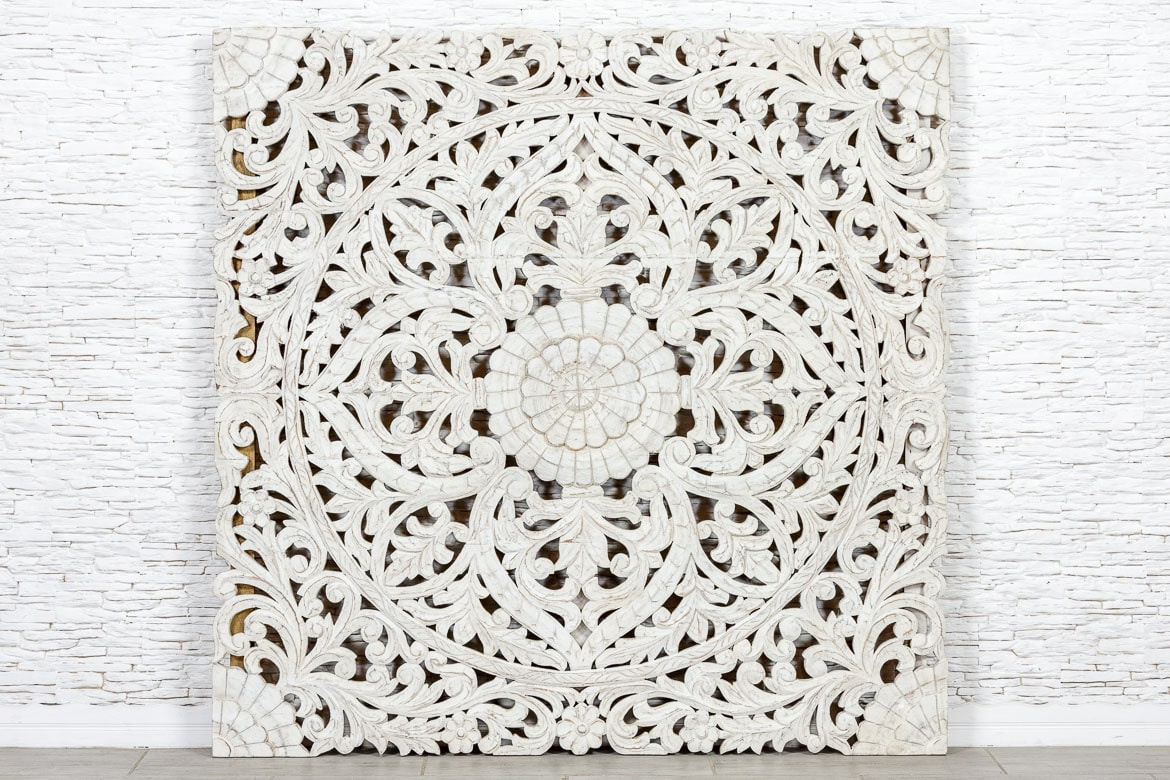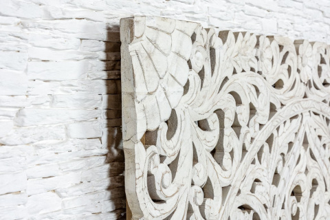 Duży, orientalny, biały panel dekoracyjny na ścianę z przepiękną mandalą. Wykonany z egzotycznego drewna mango w małej manufakturze w Indiach. To piękna ozdoba do Twojej sypialni lub salonu w stylu orientalnym. Ze względu na pokaźny rozmiar, polecamy do wysokich, przestronnych wnętrz.