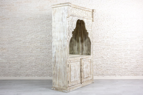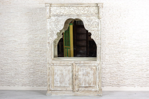 Wysoki, bielony kredens indyjski z lustrem w stylu orientalnym.