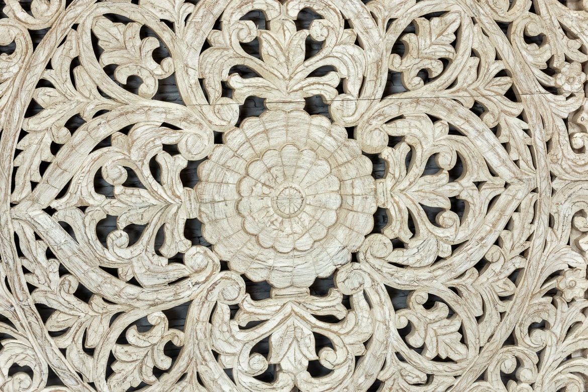 Panel wykonany z egzotycznego drewna mango w małej manufakturze w Indiach. Panel bielony i lekko przecierany oraz patynowany. To piękna ozdoba do Twojej sypialni lub salonu w stylu orientalnym. Ze względu na pokaźny rozmiar, polecamy do wysokich, przestronnych wnętrz.