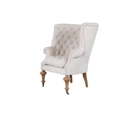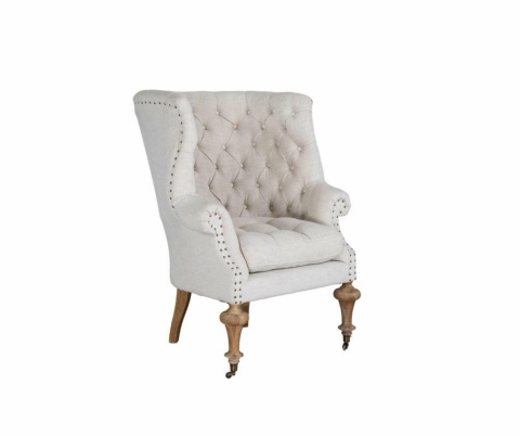 Ten wyjątkowy mebel stworzono, inspirując się stylem dworkowym z dawnych lat. Fotel na pięknych, toczonych drewnianych nogach, z których przednie usytuowano na zgrabnych, eleganckich małych kółeczkach. Lniana tapicerka zestawiona z drewnem dębowym tworzy wyjątkową całość.