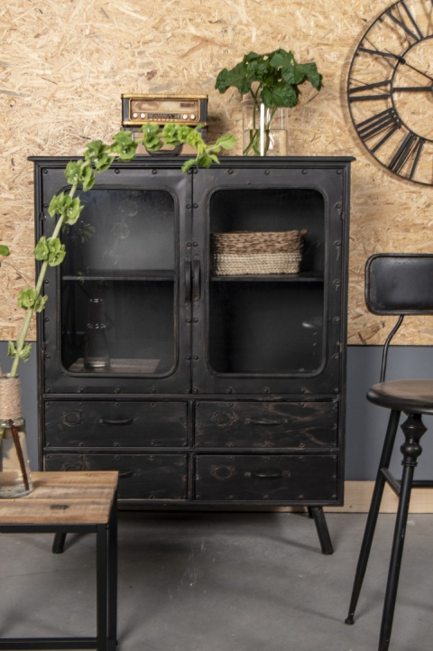 Ta designerska komoda w stylu industrialnym z topornym, fabrycznym wykończeniem, doskonale wpasuje się w surowe wnętrze. Witryna posiada duży, przeszklony schowek z półką i cztery dość pojemne szuflady, w których możesz schować np. sztućce lub inne przedmioty. Ten wyjątkowy mebel wspaniale wyeksponuje szkło lub ceramikę w loftowej kuchni, a także ozdoby i ramki ze zdjęciami w surowym industrialnym salonie.