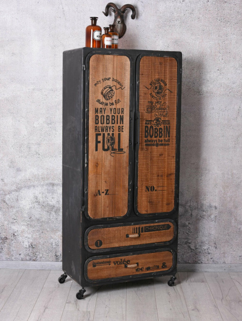 Industrialna, wysoka drewniana szafa na metalowych kółkach.