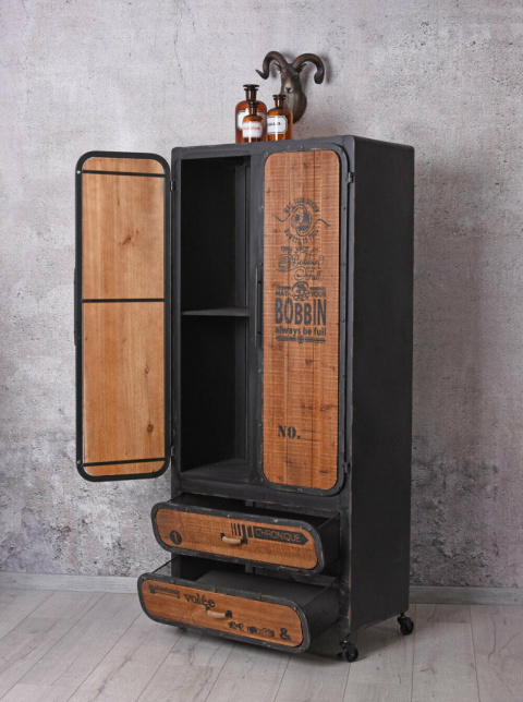 Ten wyjątkowy mebel to idealna propozycja do aranżacji fabrycznych i loft. Czarny kolor w połączeniu brązowym odcieniem drewna to stylistyczny strzał w dziesiątkę. Całość została specjalnie postarzona, dla uzyskania autentycznego efektu mebla z fabryki. Szafka na zgrabnych kółkach, które oprócz walorów estetycznych, pozwolą Ci łatwo utrzymać czystość pod meblem lub w razie potrzeby przesunąć go w inne miejsce. Posiada schowek z półką i dwie szuflady.