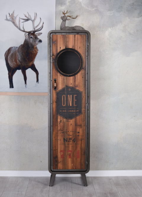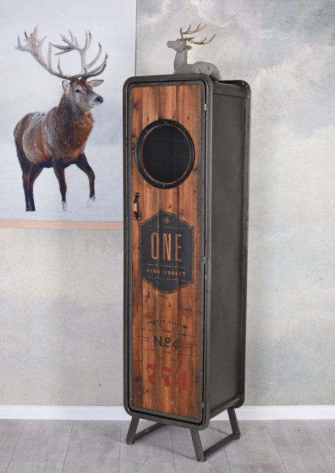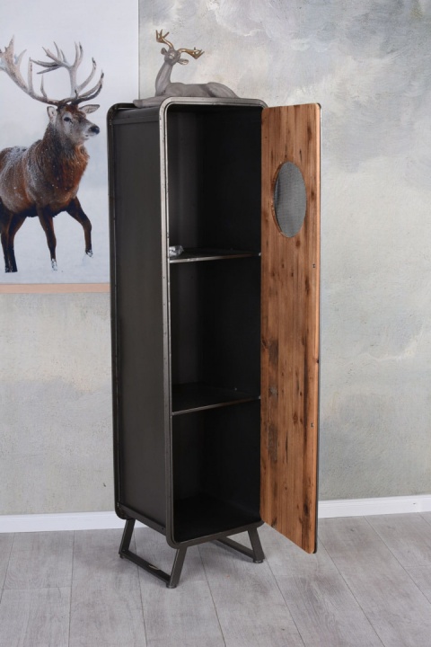 Wysoka, czarna szafka industrialna z drewnianym frontem.