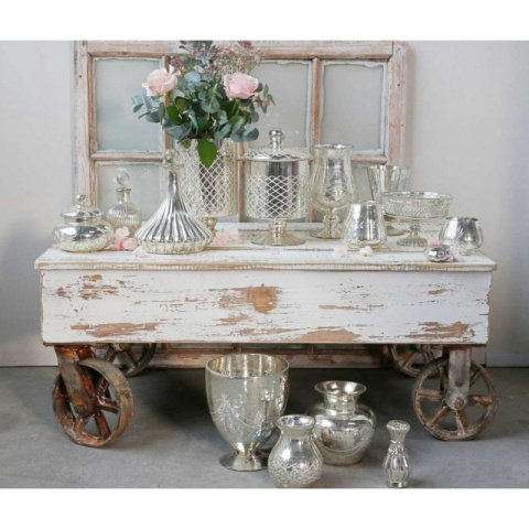 Postarzany stolik vintage na metalowych kółkach