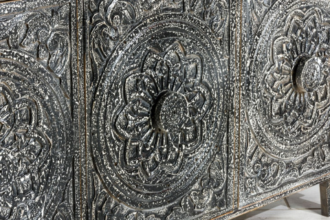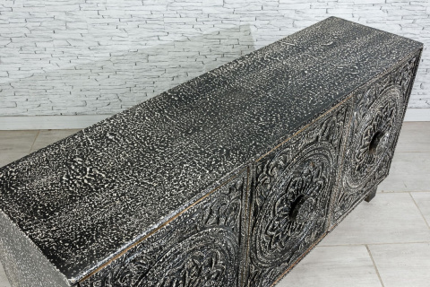 Ozdobne fronty z wyrzeźbionymi mandalami tworzą trójwymiarowy efekt. Mebel ma kolor czarno-biały i pomalowany został wypukłą farbą strukturalną, której właściwości widać na przedostatnim zdjęciu. Komoda posiada duże schowki z półkami, które z łatwością pomieszczą wiele przedmiotów. Jest bardzo uniwersalna, więc sprawdzi się właściwie wszędzie. Idealna zarówno do salonu, sypialni, przedpokoju czy nawet do orientalnego biura. Polecamy zestawić z innymi meblami indyjskimi dostępnymi w naszej ofercie.