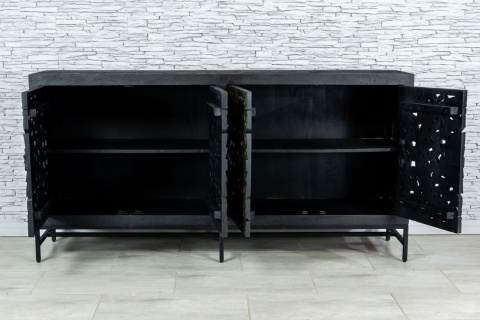 Ażurowe, ozdobne fronty z wyrzeźbionymi mandalami, delikatnie pomalowano na odcień starego złota i przetarto. Pozostała część mebla ma kolor czarny w matowym wykończeniu. Komoda posiada dwa niezależne schowki z półkami, które z łatwością pomieszczą wiele przedmiotów.