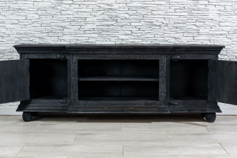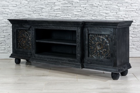 Komodę wykonano w małej, indyjskiej manufakturze z egzotycznego drewna mango. Mebel został pomalowany transparentnie, dlatego pod warstwą czarnej, matowej farby, widać naturalne usłojenie mangowca. Orientalne fronty szafek z przepięknymi mandalami, pomalowano łącząc czerń ze złoceniami. Tworzy to idealny kontrast i dodaje komodzie wiele uroku. Szafka posiada dwa zamykane schowki i otwartą półkę.