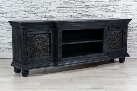 Indyjska, czarna szafka RTV ze złotymi mandalami w stylu orientalnym.