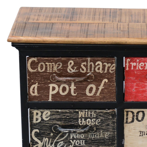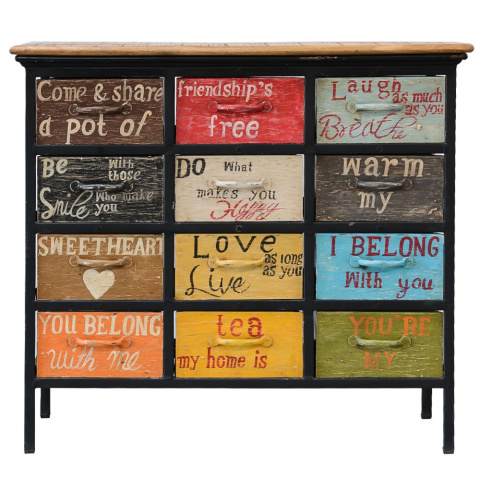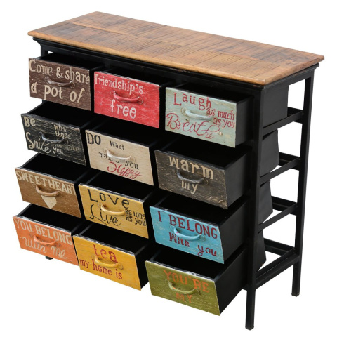 Loftowa komoda indyjska z kolorowymi szufladami. Metalową, surową konstrukcję połączono z drewnianym blatem i intensywnymi kolorami. To ciekawe zestawienie przypadnie do gustu wielbicielom niebanalnych form. Każda z dwunastu szuflad została ozdobiona pozytywnymi i romantycznymi tekstami w języku angielskim. Mebel idealny dla pary. Odnajdzie się w każdym pomieszczeniu.