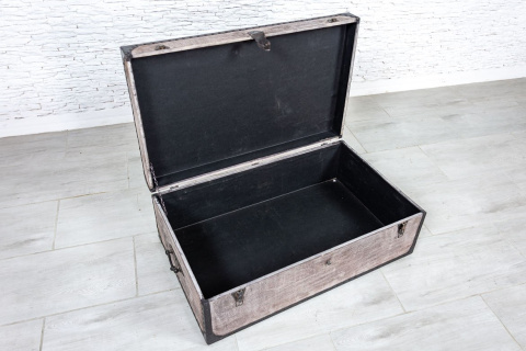Unikatowy kufer indyjski wykonany ze sklejki pokrytej płótnem bawełnianym w odcieniu brudnego różu wpadające we wrzos. Skrzynię wykończono żelaznymi uchwytami i zawiasami, a także ozdobiono ją ćwiekami. Na wieku widoczny jest wzór krzyża. Taki kufer może być schowkiem, siedziskiem, a także stolikiem kawowym. Polecamy do wnętrz orientalnym, kolonialnych i loft.