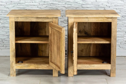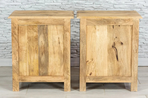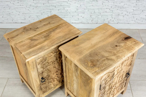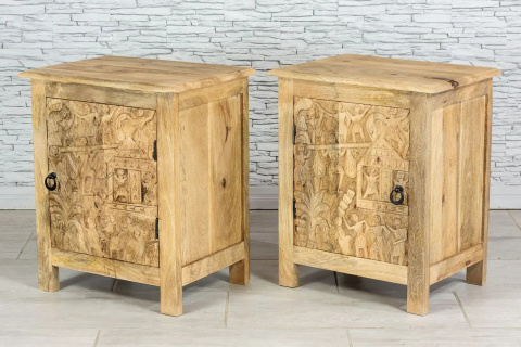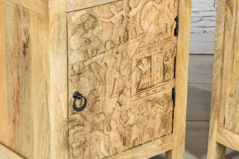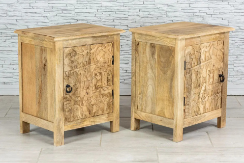 Para drewnianych szafek nocnych w stylu etnicznym. Szafki wykonano w małej, indyjskiej manufakturze z egzotycznego drewna mango. Fronty ze scenkami rodzajowymi świetnie komponują się z naturalnym wykończeniem drewna i żelaznymi uchwytami. Powierzchnię zabezpieczono woskiem.