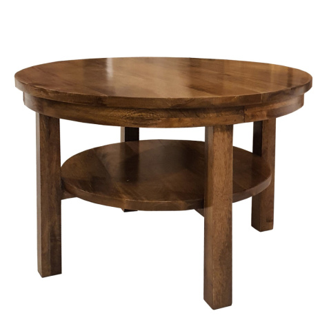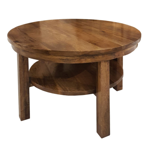 Okrągły, drewniany stolik kawowy z mago z dolną półką.