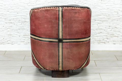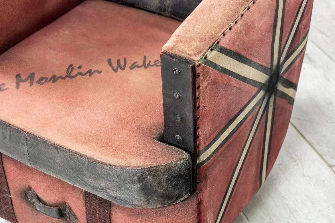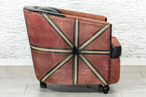 Fotel celowo przecierany i postarzany dla uzyskania efektu vintage. Ma oryginalny kształt i jest niezwykle wygodny. Zewnętrzna strona fotela inspirowana jest flagą Wielkiej Brytanii. Na siedzisku umieszczono duży napis, a na podłokietnikach dodatkowo ozdobiono go dekoracyjnymi ćwiekami. Dzięki swojemu ponadczasowemu designowi jest również bardzo uniwersalny stylistycznie.