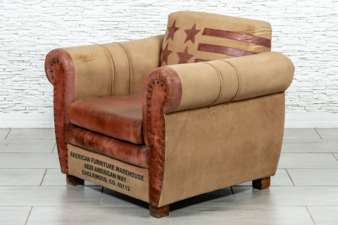 Oryginalny fotel indyjski z flagą USA, tapicerowany skórą naturalną i grubym płótnem. Ma klasyczny kształt i jest niezwykle wygodny. Stylowe podłokietniki i plecy mebla ozdobiono dodatkowo mosiężnymi ćwiekami. Dzięki swojemu nietuzinkowemu designowi jest również bardzo uniwersalny stylistycznie.