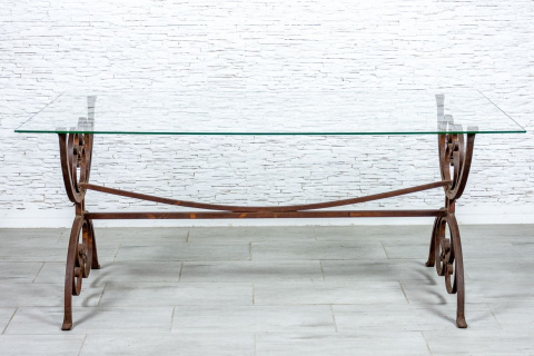 Duży, prostokątny stół z Indii na ozdobnej, kutej podstawie. Niezwykle dekoracyjny i strojny. Jego szklany blat wykonano z kilkakrotnie hartowanego szkła o grubości 8mm, które przepięknie komponuje się z żelaznym stelażem. Stół zachwyca kształtem i nietuzinkowym stylem. Przepięknie ozdobi przestronną jadalnie w oryginalnym wnętrzu.