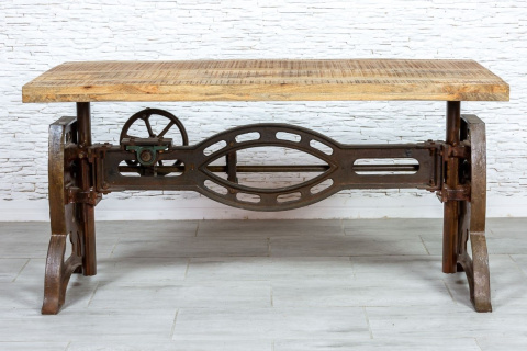Indyjski stół industrialny na ciężkiej, żelaznej podstawie rustykalnej z korbą i przekładaniami ślimakowymi, odpowiadającymi za regulację wysokości. Blat wykonano z litego drewna mango w naturalnym jego odcieniu. Toporne wykończenie idealnie wpisuje się we współczesne trendy. Przy stole może usiąść komfortowo sześć osób. Polecamy do wnętrz loft/industrial i rustykalnych