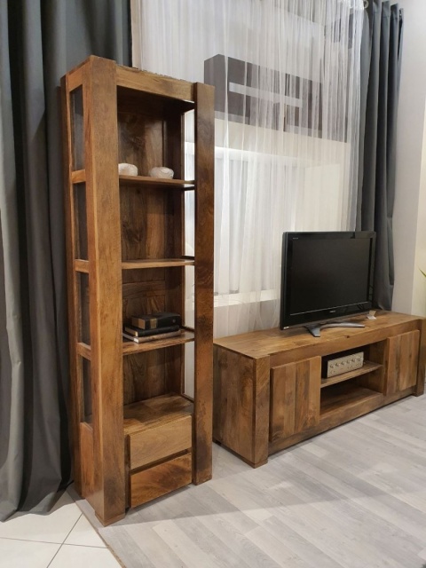 Drewno mango w kolorze toffi i zabezpieczone bezbarwnym, ekologicznym lakierem wodnym. Ten wysoki regał został w całości wykonany z litego jednego gatunku drewna (fronty, blaty, konstrukcja, dna szuflad i plecy). Mebel posiada dwie szuflady, cztery otwarte półki oraz przeszklone boczne ścianki.