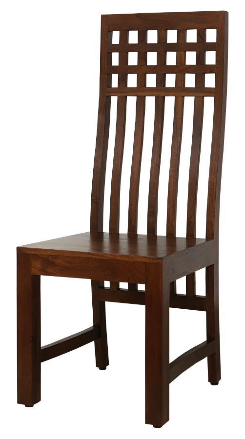 Krzesło wykonane w małej manufakturze w Indiach z wysokiej jakości drewna mango w kolorze ciepłego brązu i wykończone lakierem satynowym.